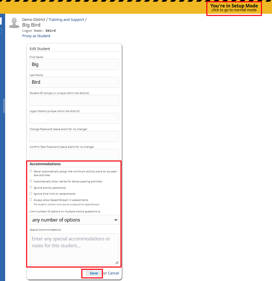 Click Student Setup to enter setup mode.